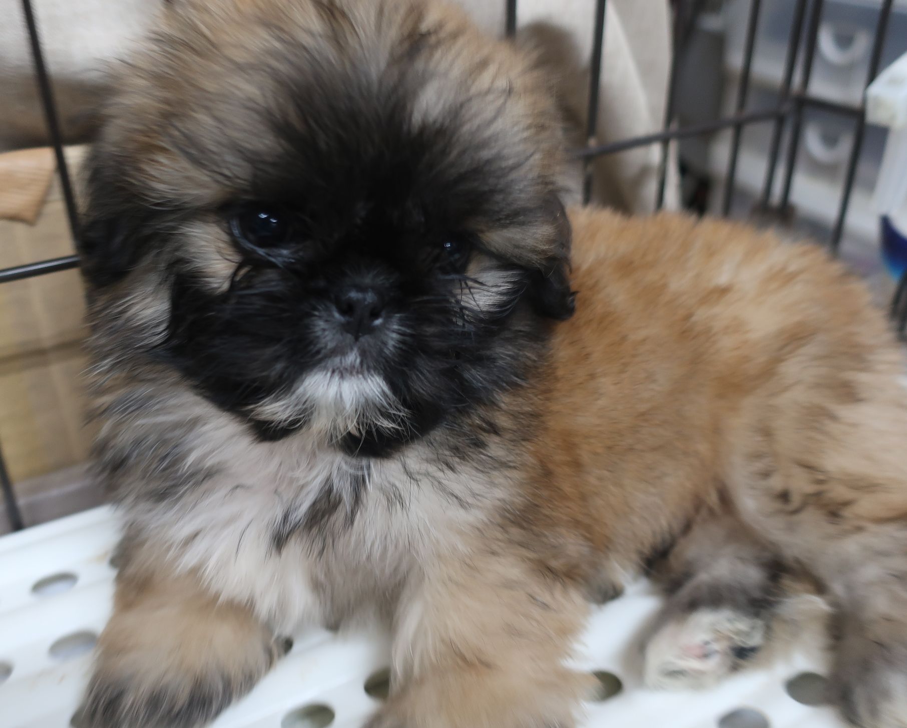 ハナペチャでとても元気なミックス犬が生まれました。体色はフォーンです。 父親がペキニーズで母親がシーズーです。 顔の黒い部分は徐々に薄くなります。 現在のところ鼠経ヘルニアや出へそ、嚙み合わせ等問題ありません。